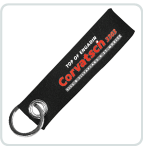 Filz Schlüsselanhänger: Corvatsch – TOP OF ENGADIN Filzband mit 2-farbigem Druck Bandfarbe: Schwarz Format: 240 x 30 x 3 mm Verarbeitung: Als Schlaufe konfektioniert Endformat: 120 x 30 mm Verschlüsse: Metallöse + Schlüsselring 30 mm Besonderheit: Woll-Filz |