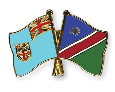 Selbstverständlich sind die Fahnen-Pins auch in umgekehrter Zusammenstellung erhältlich: Links die namibische Fahne und daneben die fidschianische Flagge.