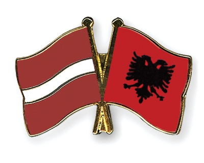 Selbstverständlich sind die Fahnen-Pins auch in umgekehrter Zusammenstellung erhältlich: Links die albanische Fahne und daneben die lettische Flagge.