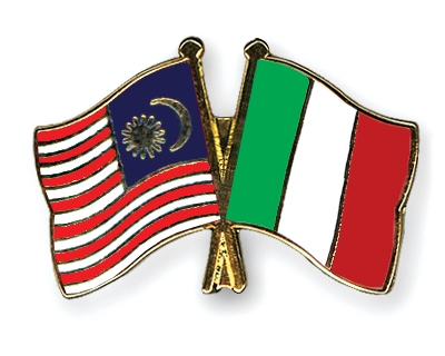 Selbstverständlich sind die Fahnen-Pins auch in umgekehrter Zusammenstellung erhältlich: Links die italienische Fahne und daneben die malaysische Flagge.