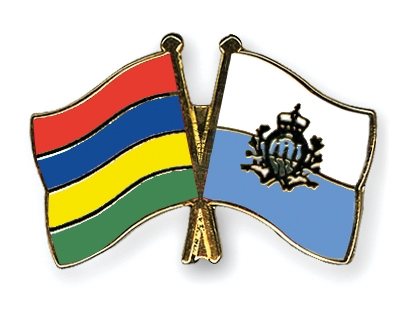 Selbstverständlich sind die Fahnen-Pins auch in umgekehrter Zusammenstellung erhältlich: Links die san-marinesische Fahne und daneben die mauritische Flagge.