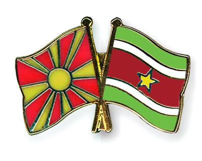 Die Cross Promotion AG liefert hochwertige Freundschaftspins mit der Mazedonien Fahne links und der Surinam Flagge auf der rechten Seite, wie oben abgebildet.