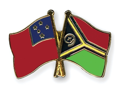 Selbstverständlich sind die Fahnen-Pins auch in umgekehrter Zusammenstellung erhältlich: Links die vanuatuische Fahne und daneben die samoanische Flagge.