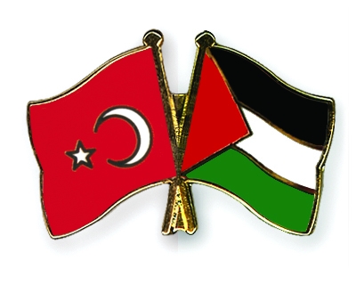 Selbstverständlich sind die Fahnen-Pins auch in umgekehrter Zusammenstellung erhältlich: Links die palästinensische Fahne und daneben die türkische Flagge.