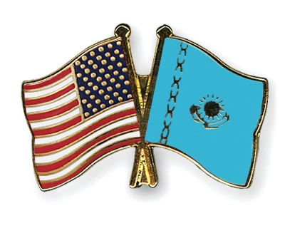 Selbstverständlich sind die Fahnen-Pins auch in umgekehrter Zusammenstellung erhältlich: Links die kasachische Fahne und daneben die amerikanische Flagge.
