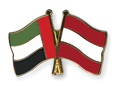 Selbstverständlich sind die Fahnen-Pins auch in umgekehrter Zusammenstellung erhältlich: Links die österreichische Fahne und daneben die emiratische Flagge.