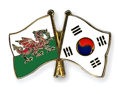 Selbstverständlich sind die Fahnen-Pins auch in umgekehrter Zusammenstellung erhältlich: Links die südkoreanische Fahne und daneben die walisische Flagge.