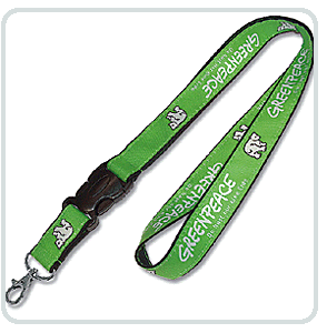 Lanyards Express: Greenpeace Eisbär Satinband mit 3-farbiger Einwebung Format: ca. 80 + 10 x 2,5 cm Verschlüsse: Karabinerhaken und Kunststoff-Schnappverschluss