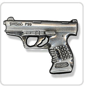 Pins: Walther Pistole P99Metall-Spritzguss, antik-silberfarben, 3D-EffektGrösse: ca. 23 x 31 mm