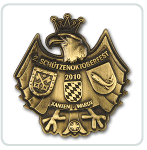 Pins: SchützenoktoberfestMetall-Spritzguss, antik-messingfarben, 3D-Effekt Grösse: ca. 40 x 43 mm