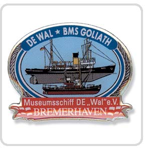 Pins: De Wal BMS GOLIATH BremerhavenOffsetdruck, 4-farbig, Trägermaterial StahlGrösse: ca. 28 x 14 mm